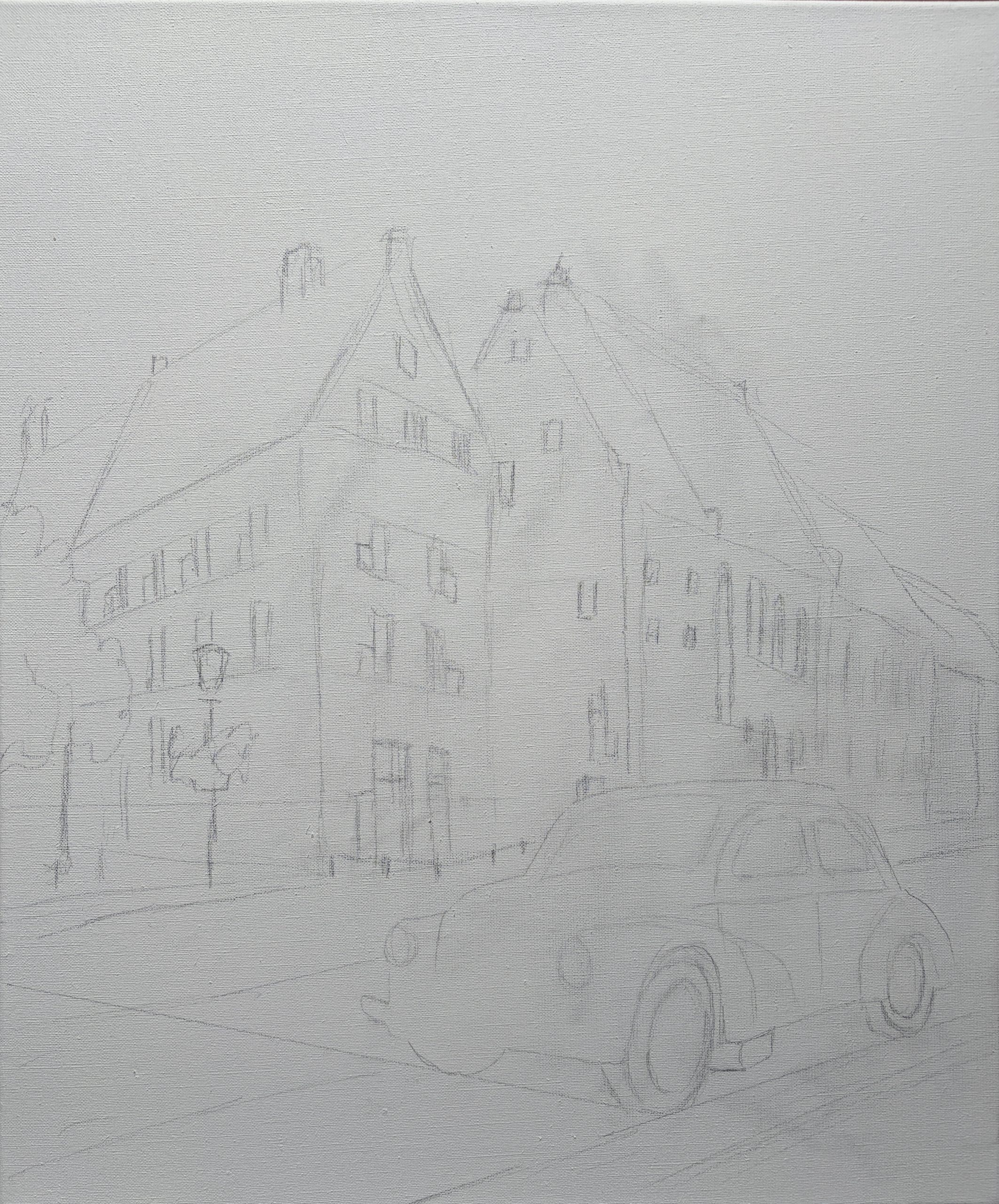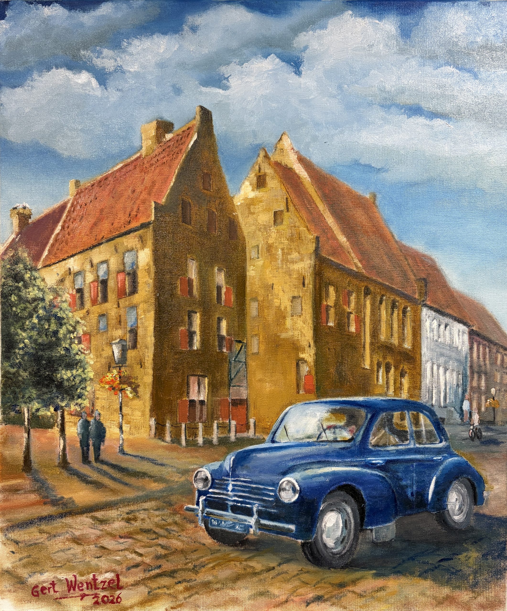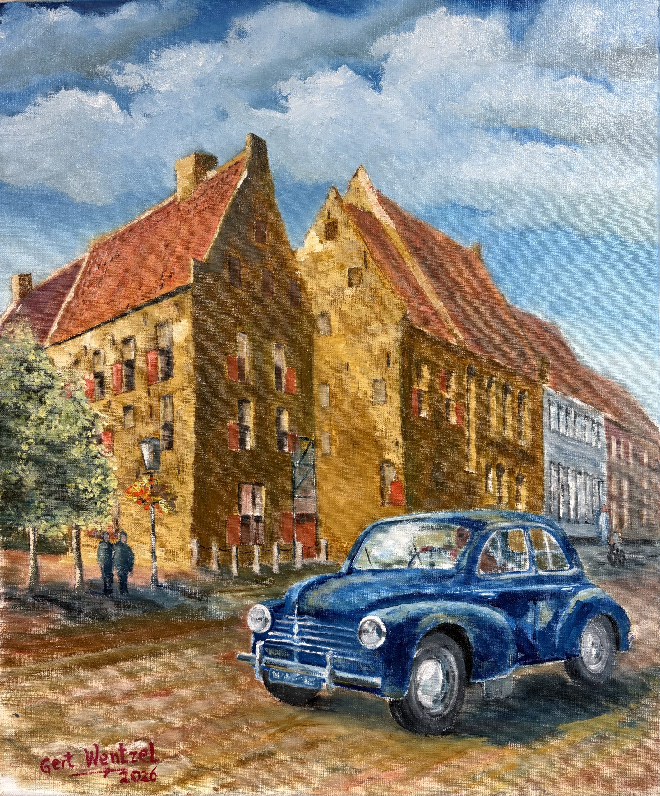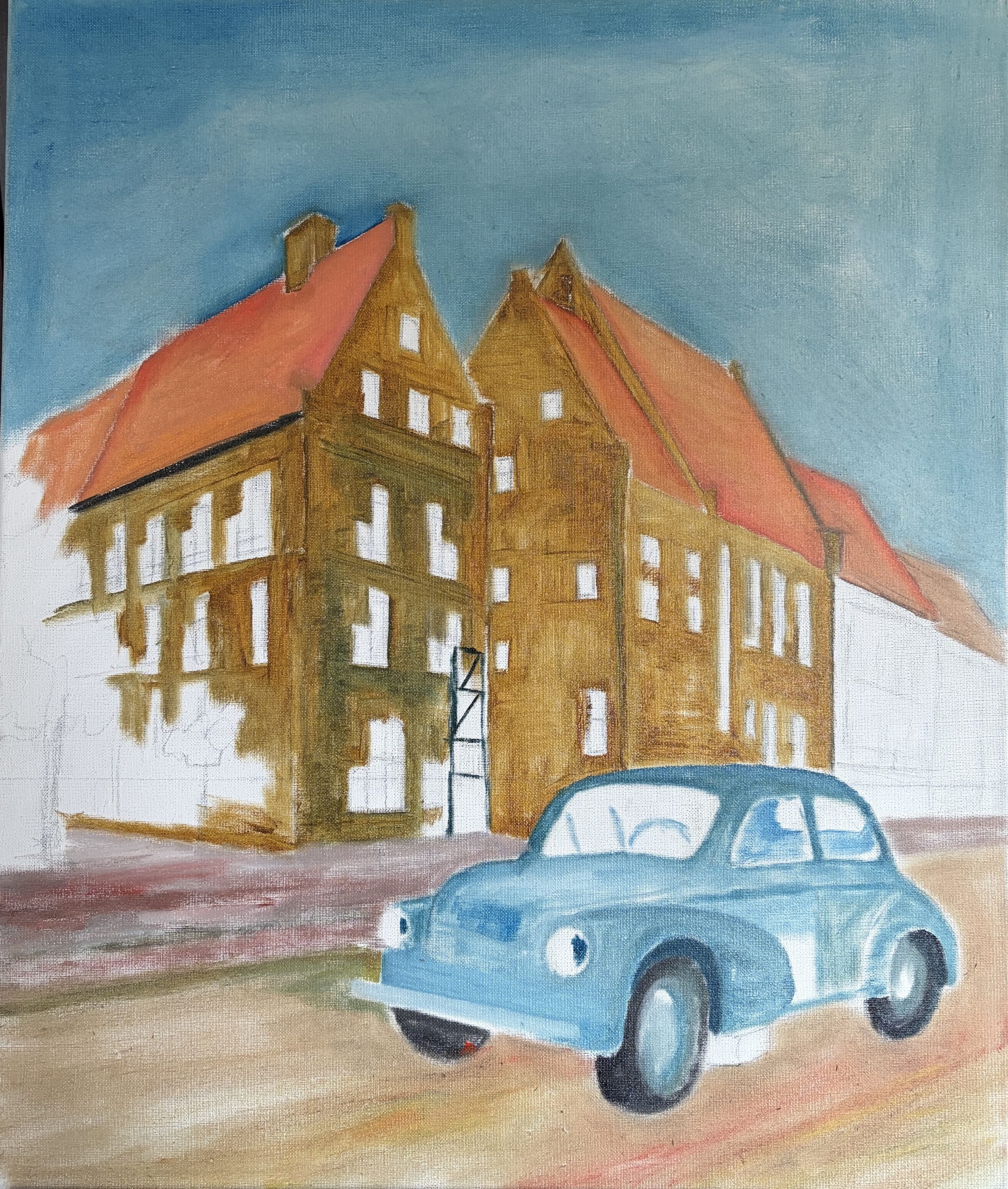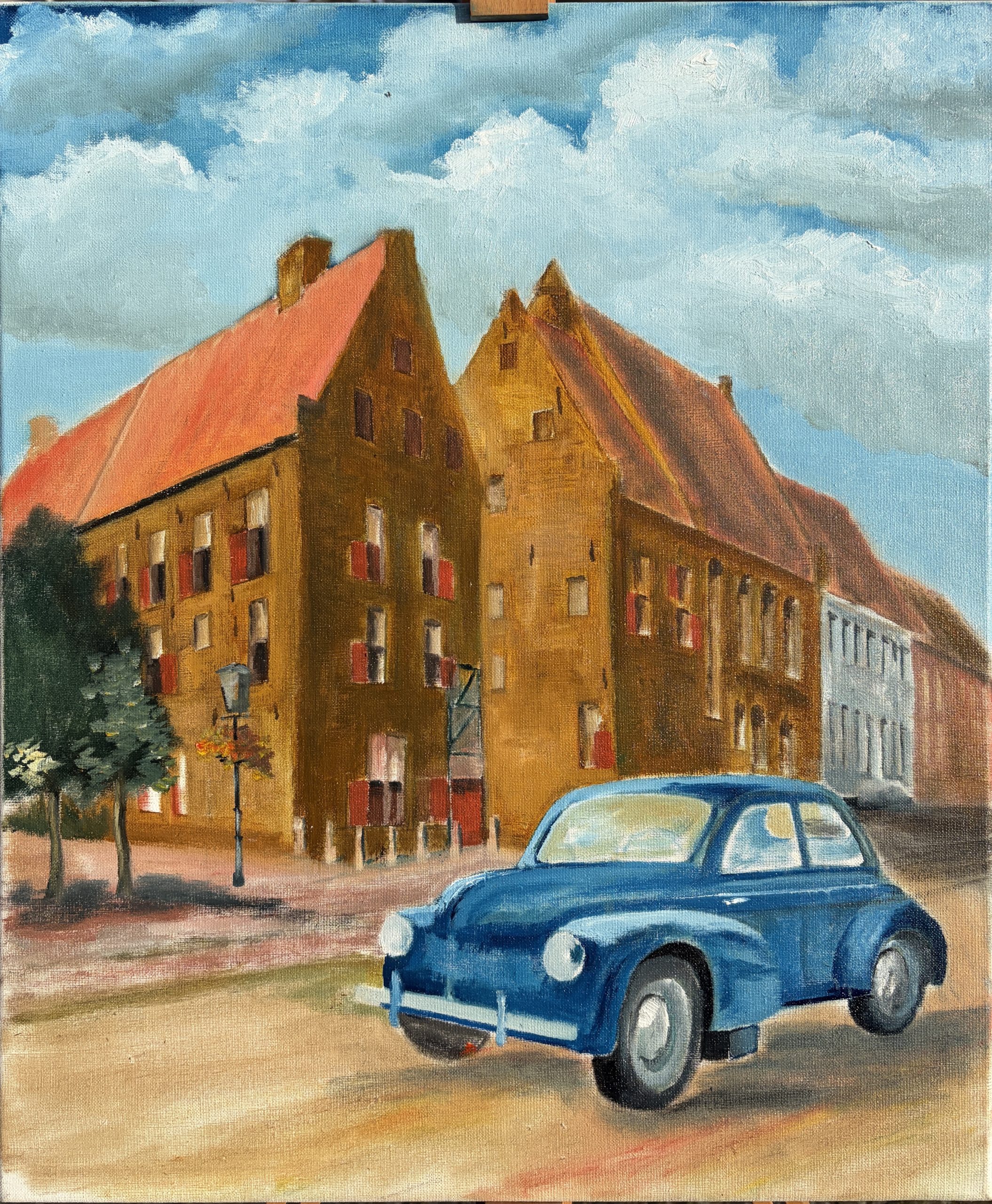 Tijdens het schilderproces heb ik vooral gelet op kleur en licht. Het blauwe van de auto moest goed werken tegenover het warme geel van het gebouw. Tegelijk wilde ik de glans en reflectie van het metaal overtuigend weergeven. In eerdere versies leek de auto nog een beetje op een speelgoedauto, maar door het licht en de reflecties aan te passen is hij naar mijn gevoel uiteindelijk geloofwaardig in het straatbeeld terechtgekomen.